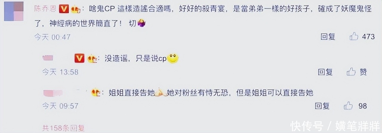 后来粉丝涌入陈乔恩微博求证,其本人亲自回应,强调仅为工作关系;部分铁粉怒斥:“只有脑子不清醒的人才会信。”风波这才勉强平息。