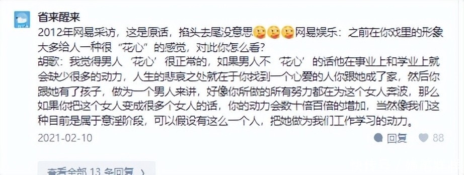 紧接着,胡歌另一段感情言论也被挖出,进一步加剧争议。