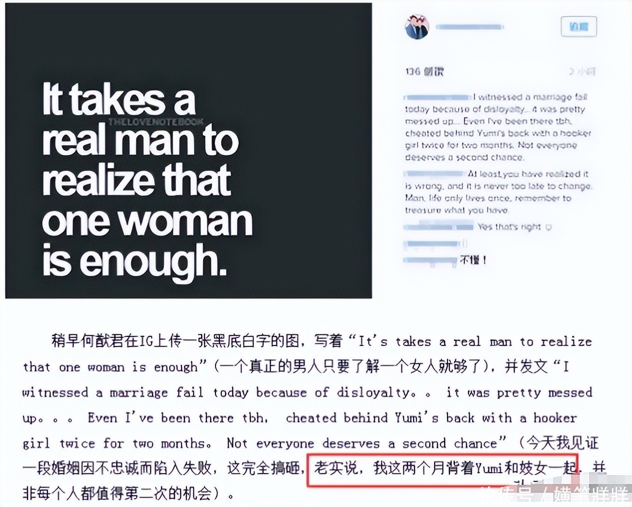 早年他在社交平台坦言:“说实话,过去两个月背着Yumi和ji女在一起,不是每个人都值得第二次机会。”