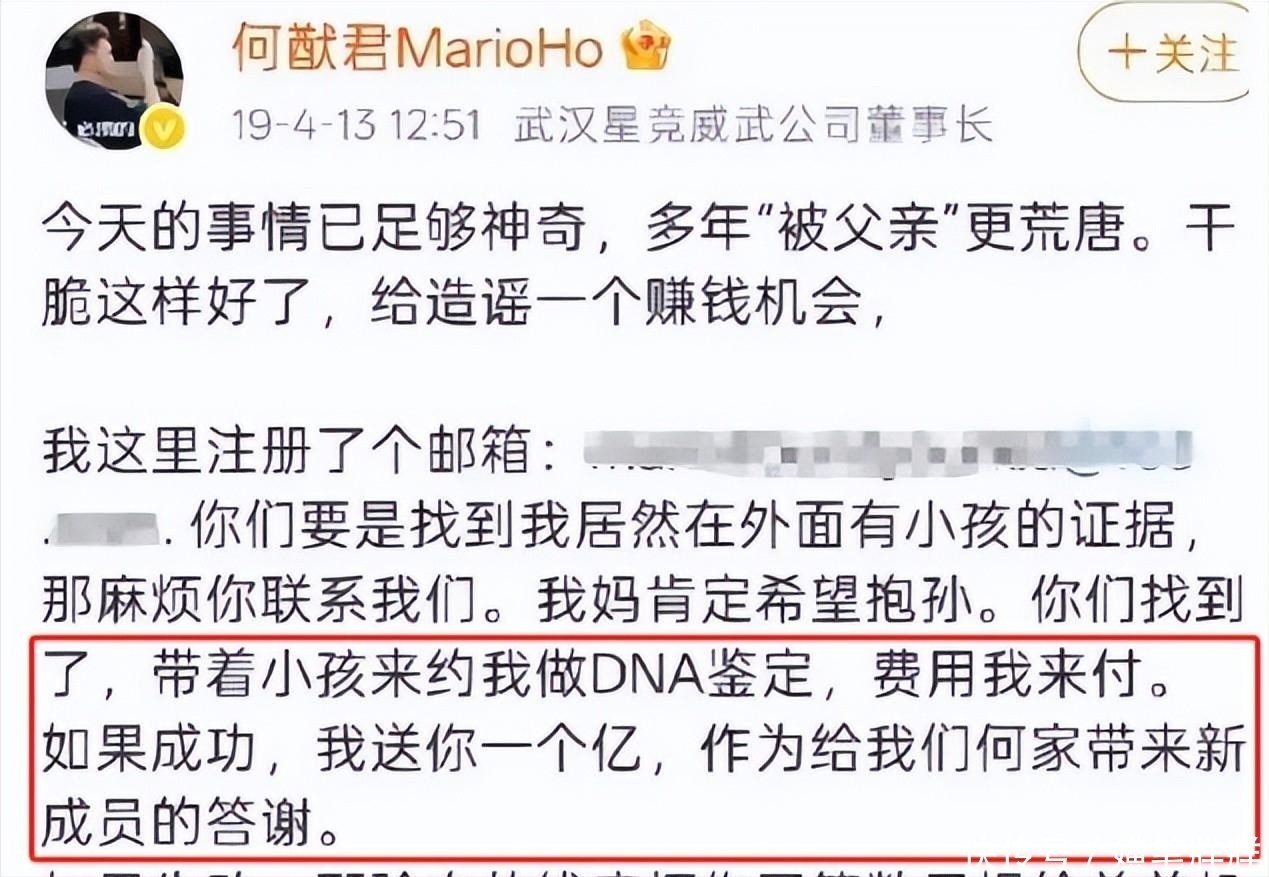 同时重新置顶2019年旧帖——当时他曾悬赏一亿元人民币征集私生子证据,此次更升级承诺:“谁有孩子,立刻验DNA,若是我的,当场转账一个亿!”