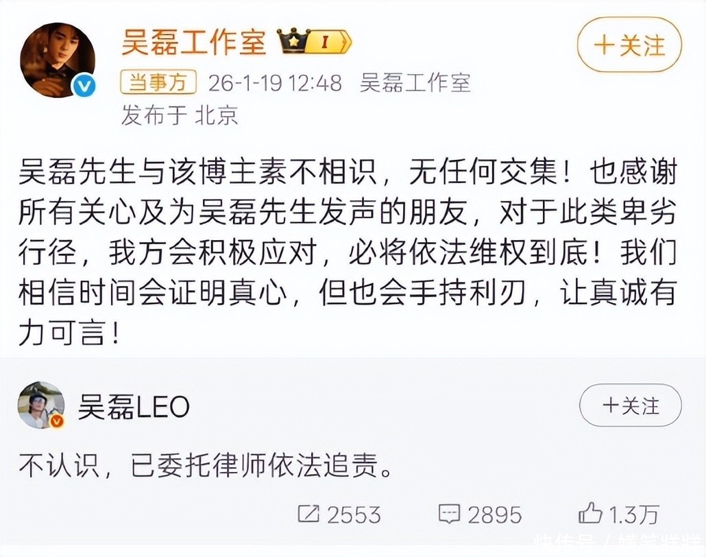 事件爆发不到六十分钟,吴磊工作室即发布严正声明,称内容纯属捏造,已委托律师介入处理。