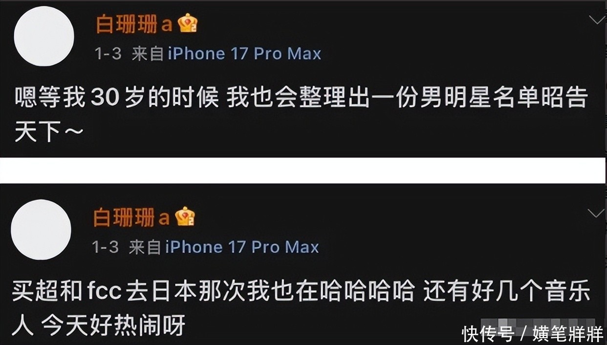 年初司晓迪事件余波未平,她便曾发博扬言:“我三十岁那年,一定要整理一份男星名单公之于众。”更在评论区直言:“睡过的男明星必须更帅才行。”